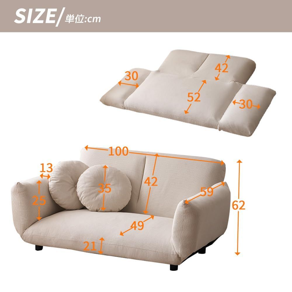 【多機能なソファー】横幅はシングルサイズ100cm。1人でゆったり寛ぐちょうど良いサイズ感です。リクライニングを倒してベッドして使えば、ゆったりサイズのローベッドとして使えます。ソファの座高高は21cmと空間を広く見せてくれるロータイプになっています。解放感をプラスしつつも、しっかりと座ることができる賢い設計はワンルームなどのお部屋にもおすすめです。座面のクッションを広げるだけで、ゆったり寛げるカウチソファに早変わり。急な来客ベッドに変えれば安心。クッションも付いているので枕としてご利用いただけます。