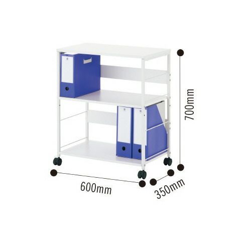 ●種別/デスクサイド●カラー/ホワイト●外寸法/幅600×奥行350×高さ700mm●天板厚さ/15mm●棚板寸法/幅564×奥行350×厚さ15mm●内寸法/幅564×奥行330×高さ(棚板上設置時)上段270、下段318mm(棚板下設置時)上段317、下段271mm●材質/フレーム:スチール(粉体塗装)、棚板:メラミン化粧板(MDF)、キャスター:PP●質量/9.5kg●耐荷重/棚1段あたり:約10kg、天板:約10kg●棚板枚数/可動棚板:1枚(46mmピッチ・2段階)