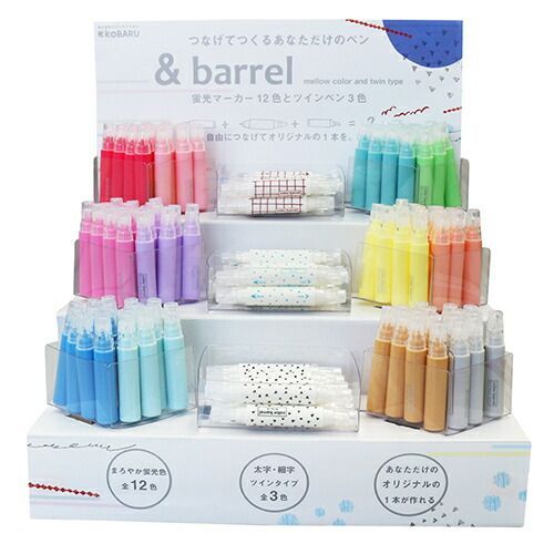 自由につなげてオリジナルの1本が作れる「&barrel〜アンドバーレル〜」。一般的な蛍光色とは違うまろやかカラーの蛍光色が12色、1本で太字・細字が書けるツインイプのペンが3色。キャップは「誤飲安全キャップ」です。【検索ハッシュタグ】#エポックケミカル#蛍光マーカー#マーカーペン#蛍光ペン#ペン#アンドバーレルメロウ#バーレル#什器#什器セット#ディスプレイセット#ディスプレイ