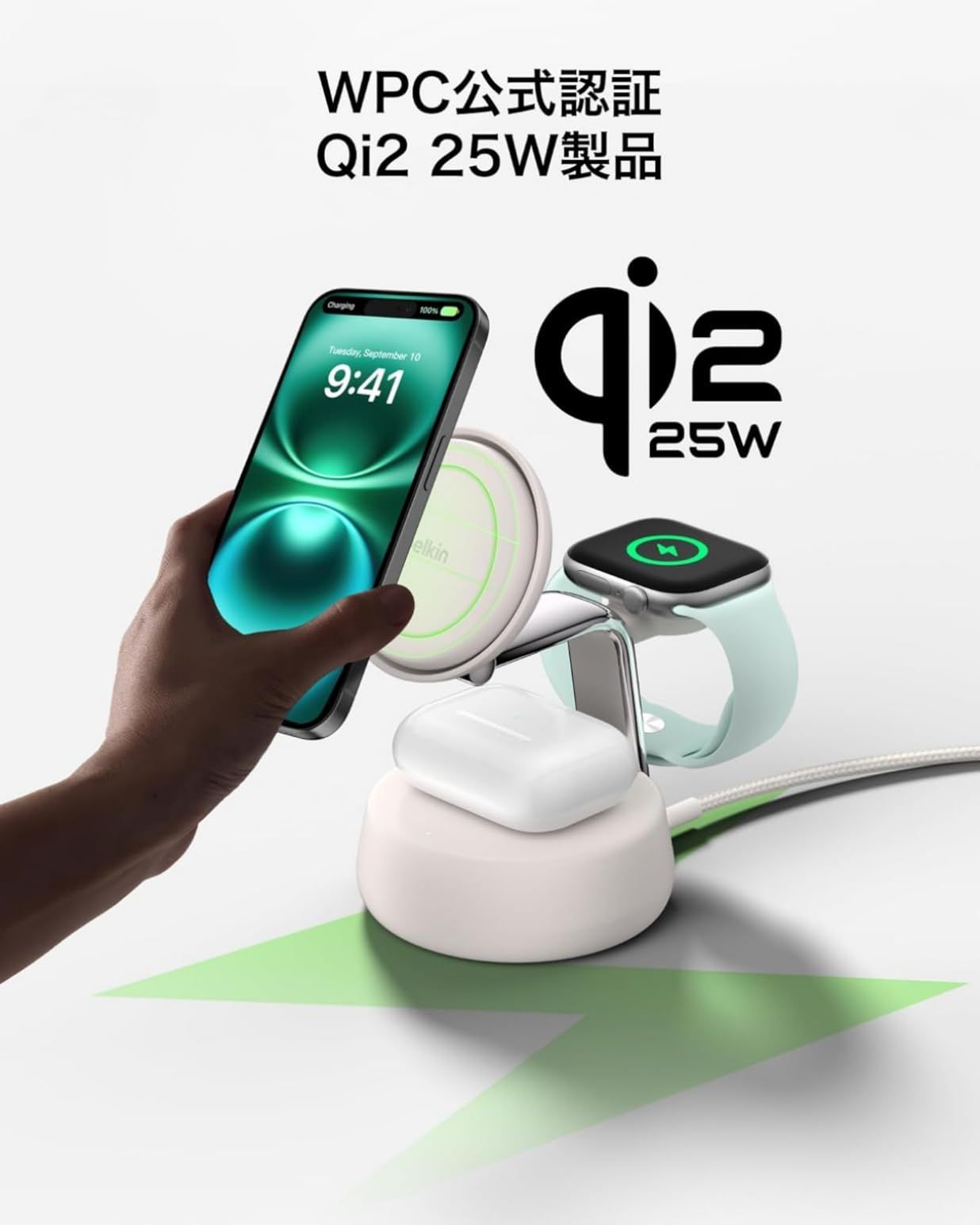 Belkin Qi 2 25 W ワイヤレス充電器 3 in 1 認証 MagSafe 急速充電 iPhone Apple Watch アップルウォッチ Google Pixel 10 Pro XL WIZ 040 dqCH 壁紙ダウンロード付き