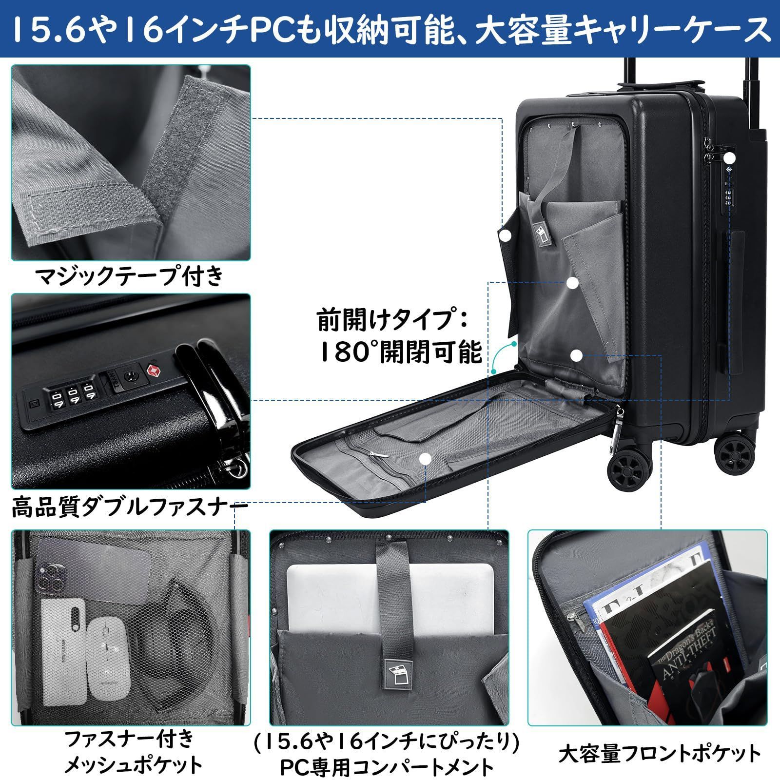 【サイズ】横35cm×幅22cm×縦48cm(三辺合計105cm)/ 【ポケット】8個 / 【2層構造】第1層:前開きコンパートメント(16インPC専用ポケット、メーンポケット、メッシュポケット)、第2層:メッシュポケット、乾湿分離ポケット、ファスナー開閉衣類コンパートメント、X型バンドで固定できる衣類コンパートメント、真空圧縮できる収納部 / ①圧縮袋は改良し、ファスナー付きタイプになりました。圧縮袋はしっかりキャリーケースの中に固定でき、中に散らばる心配はありません。②前開きタイプのスーツケースはサッと荷物を取り出せて、持ち歩く際に便利です。タブレット、書籍、携帯電話、チケットなど、荷物に合わせた細かなポケットを用意します。なお、最大16インチPC対応できます。別途パソコンケースを用意する必要はありません。