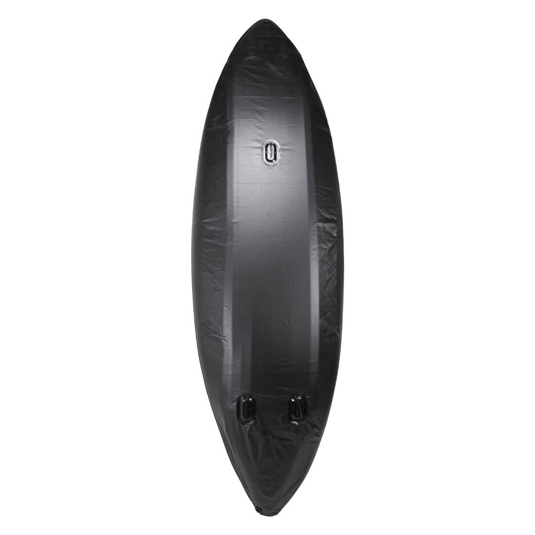 最初にフロアの空気を入れ、次にサイドチューブの1つに空気を入れます。最後に1つのサイドチューブに空気を50%入れます。全体の配置を確認します。問題がなければ、0.1bar(1.5psi)の空気圧を超えない範囲で空気を入れます。空気の入れすぎにご注意ください。 バルブをしっかりと閉めてください。3つのスケグを装着します。水の少ない川ではスケグを使用しないでください。極端に熱くなった場合は、カヤックの過膨張によるダメージを避けるために、カヤックを水から出して少しだけ空気を抜いてください。空気を注入したまま直射日光の下に放置しないでください:膨張するおそれがあります。
