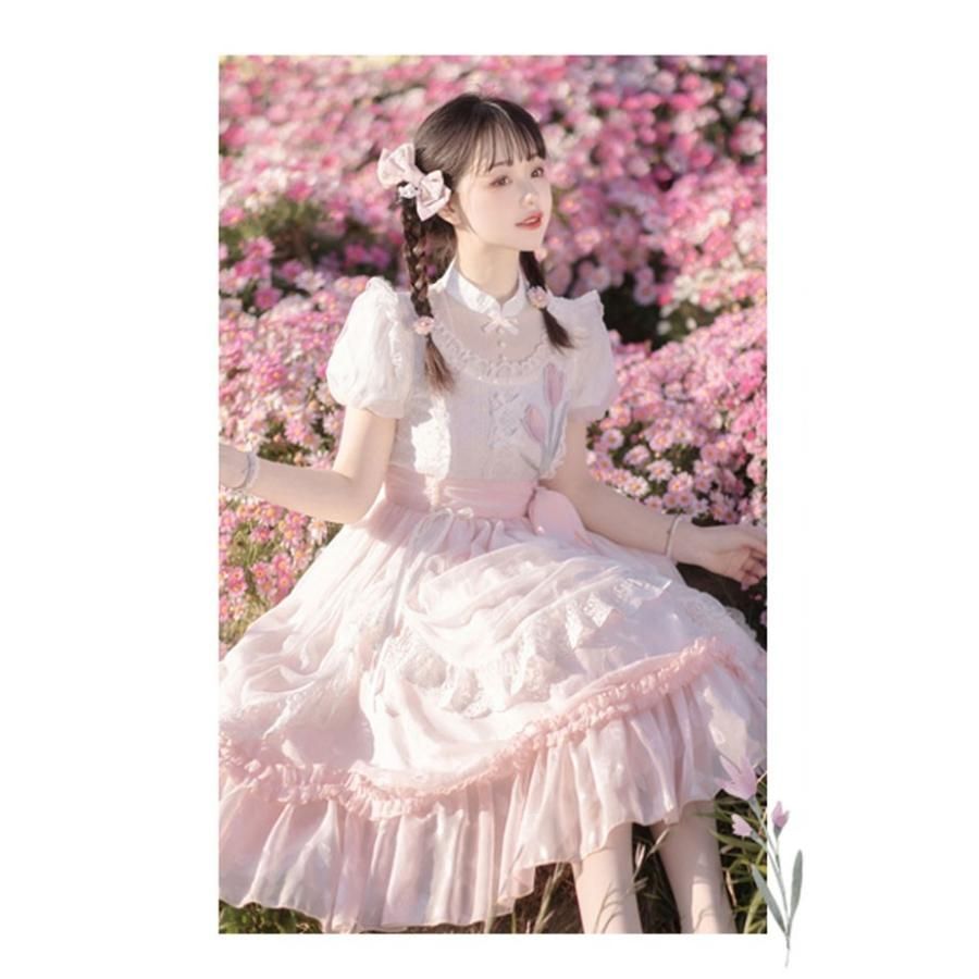 ロリータ ワンピース 洋服 花柄 レディース 膝丈 半袖 リボン パフスリーブ フリル レース Aライン ハイウエスト ロリィタファッション 上品 エレガント