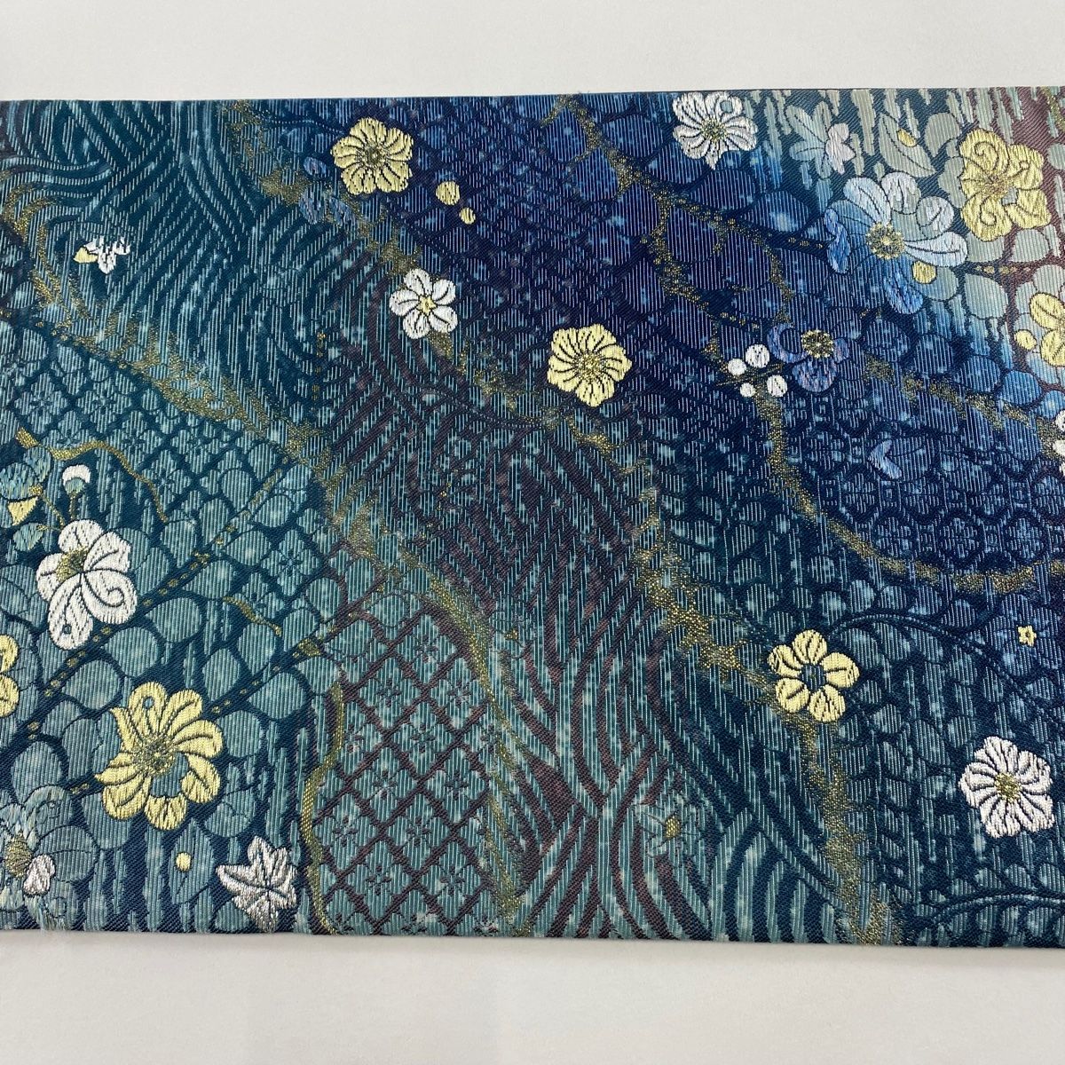 袋帯 草花 波 箔 金銀糸 青 六通 正絹