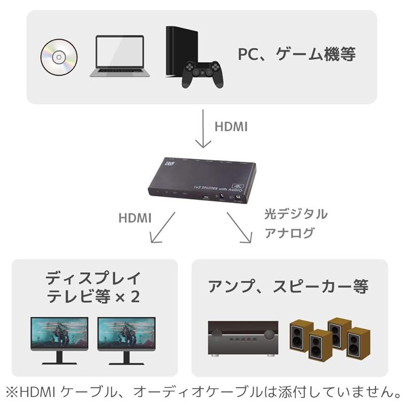 解像度の違うディスプレイを活用 外部音声出力も なHDMI 分配器 2分配 RS-HDSP 2 PA-4 K 0