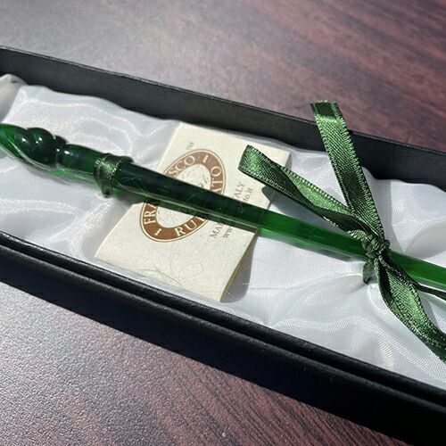 詳細情報イタリア・ルビナート社のガラスペン。インクに直接ペン先を浸すことにより文字を描くことができるペンです。使い終わったら水で洗って、水気をふき取り、箱にしまうだけなので簡単にお手入れが出来ます。