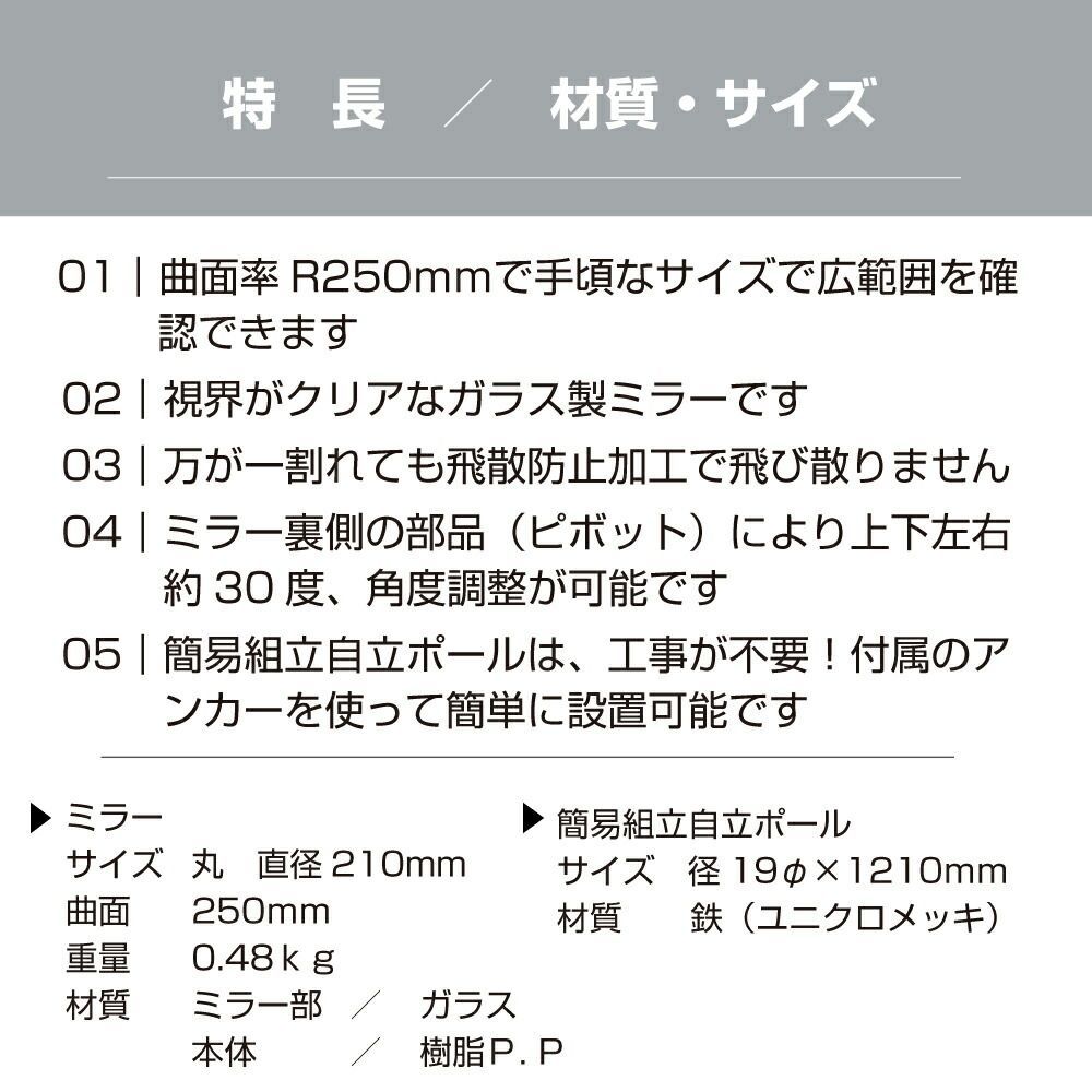 このミラーは簡易自立式で、スタンドやポール、アンカーが付属しており、設置が非常に簡単です。高さは1210mmで、視認性を確保しつつ、スペースを有効に活用できます。