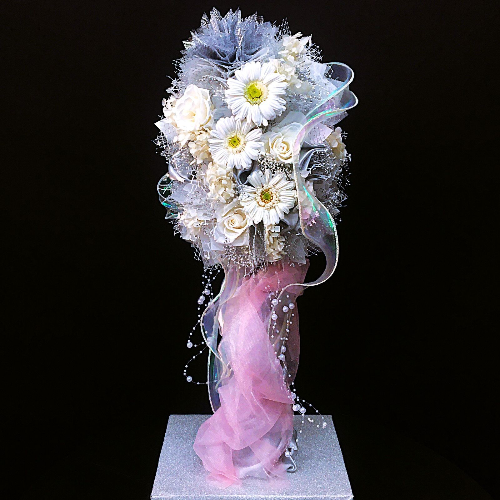 トロフィー型アレンジメント(ホワイト)は、高級感あふれるホワイトの色合いで表現された上品なアレンジが特徴です。この商品は、特別なギフトとしても日常のインテリアとしても最適で、贈られた方の心に残る印象を与えます。ゴージャスなデザインが、生活空間に優雅さを演出します。