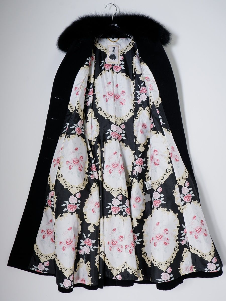 【商品情報】裏地は花柄・表地にも薔薇の刺繍。フォックスファーがあしらわれてゴージャス感あふれる一着です。ファー部分は着脱可能。