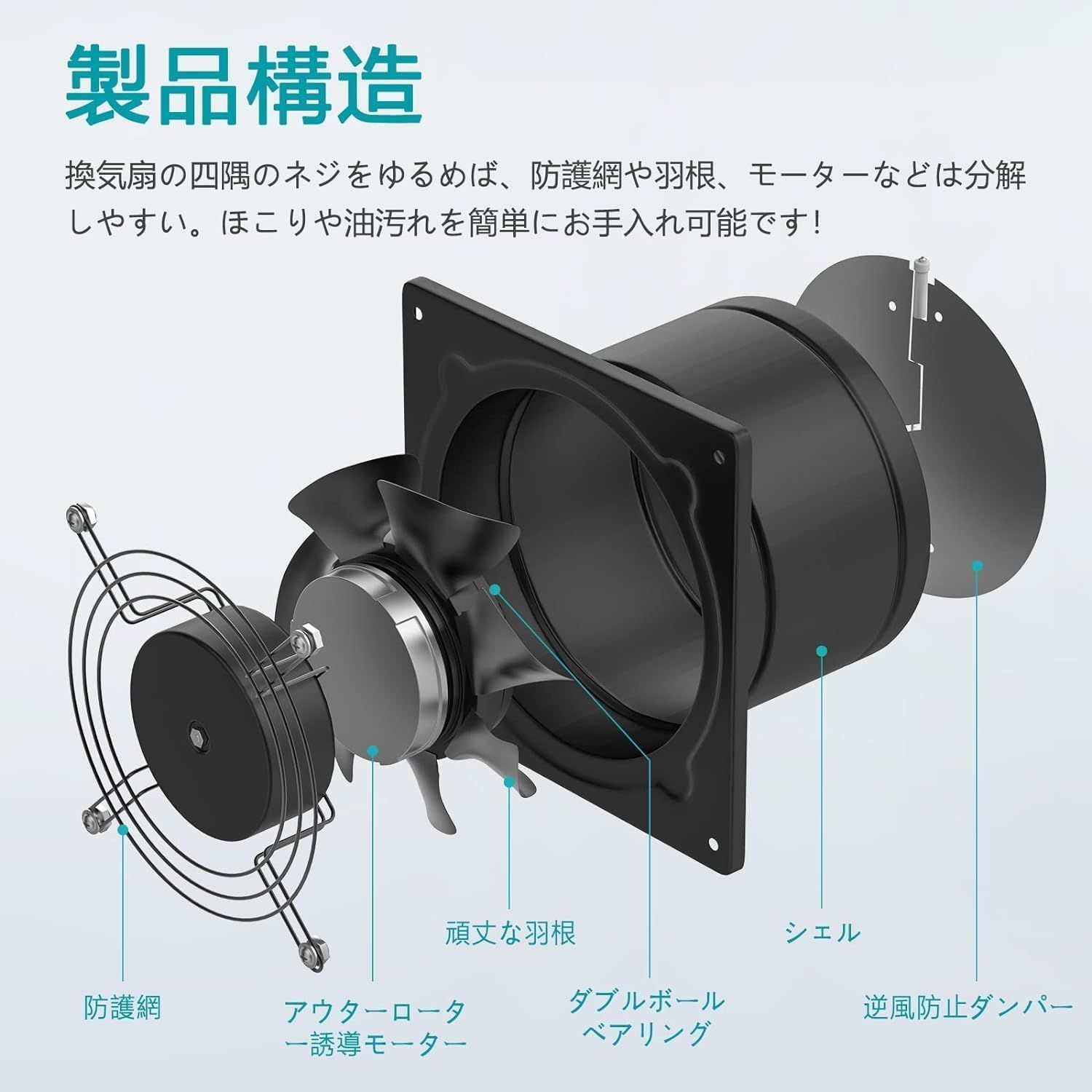 【強力なモーター&手入れ簡単】換気扇は強力な誘導モーターを採用され、通常のモーターと比べて、アップグレードされたモーターは摩擦係数を減らし、電力を効果的に節約し、もっと効率的に換気する。また、換気扇の四隅のネジをゆるめば防護網、内部の羽根、モーターなどを分解しやすい。ほこりや油汚れを定期的お手入れ可能です。換気効果や製品耐用年数の延長に役に立つ。