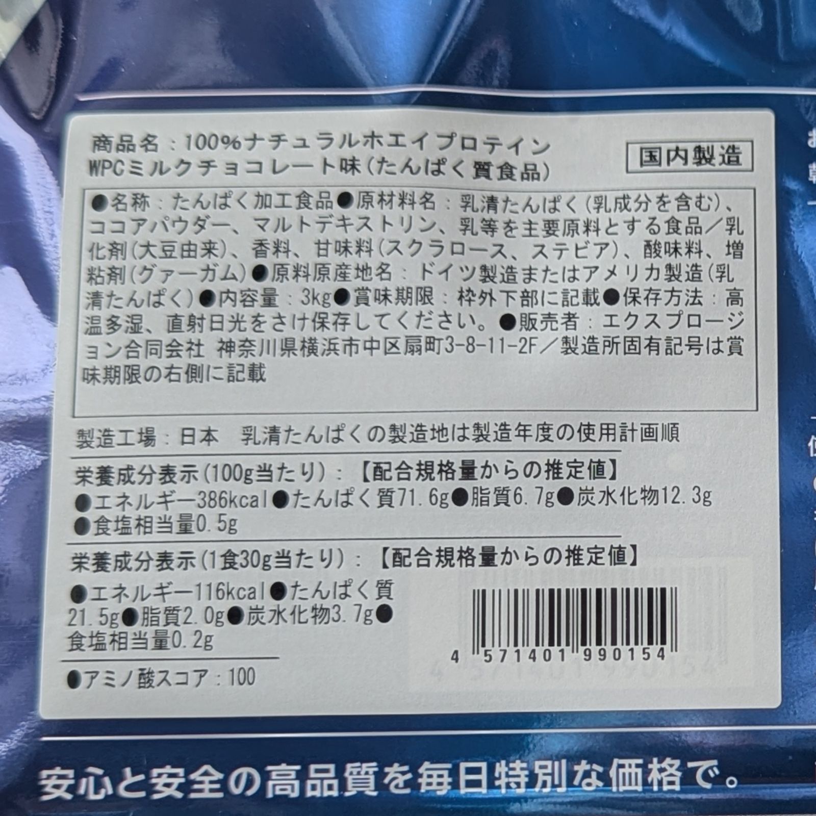 ミルクチョコレート味 3 kg エクスプロージョン WPC ナチュラルホエイプロテイン