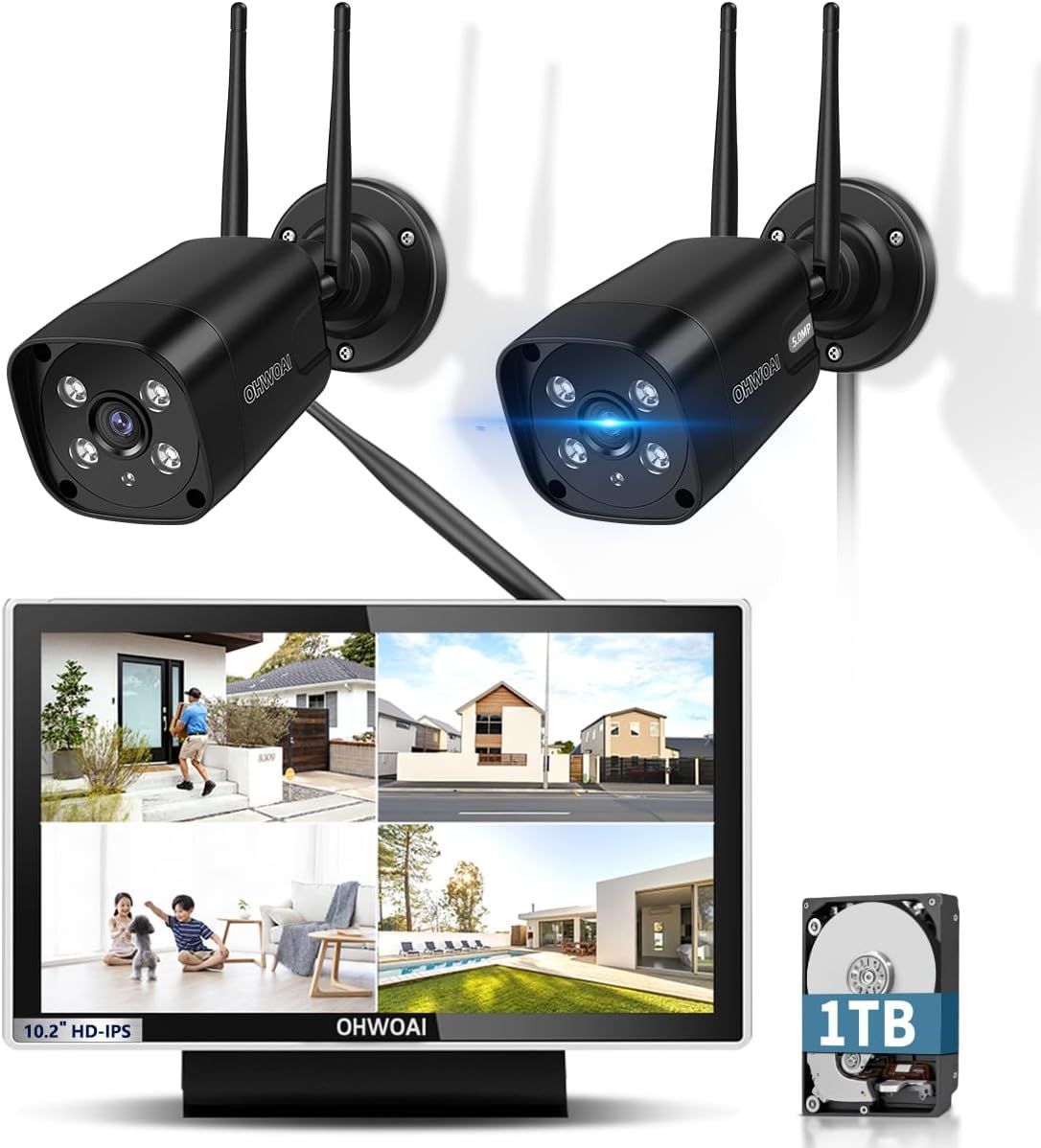 【業界唯一ダブルアンテナ搭載】OHWOAI ワイヤレス防犯カメラセット 2台 屋外用 130°超広角 音声録画 双方向通話 動体検知 10台まで増設可 遠隔監視 APP通知 モニター付き 10インチ2台防犯カメラセット 1TB