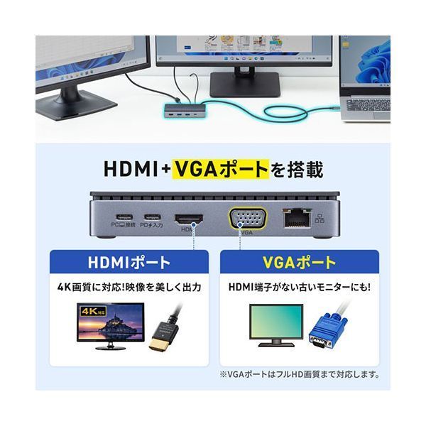 HDMIポート:3840×2160(4K/30Hz)+VGAポート:1920×1080(フルHD/60Hz)