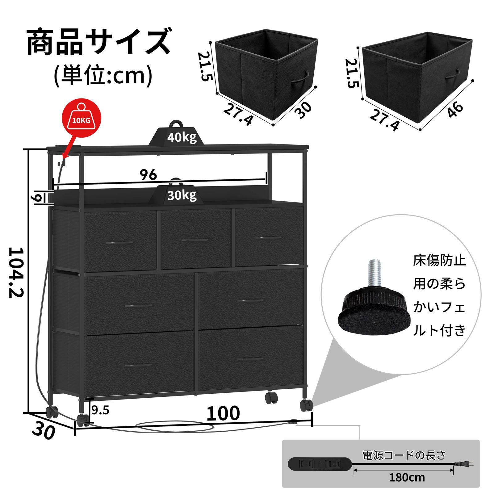 LunarLight チェスト タンス 幅100奥行30高さ104.2㎝ 収納チェスト 収納ケース コンセント2口付き ストッパーキャスター付き 移動式と 固定式2機能 テレビ台としても使える 頑丈 組立簡単 耐震転倒防止 大容量収納3段7杯 引き出し付き 棚板2枚 (ブラック)