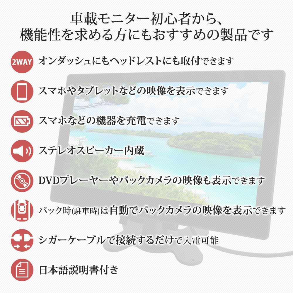 ・HDMI入力対応・USB充電可能(5V/1A)・ステレオスピーカー内蔵・シガー電源対応・自動調光センサー