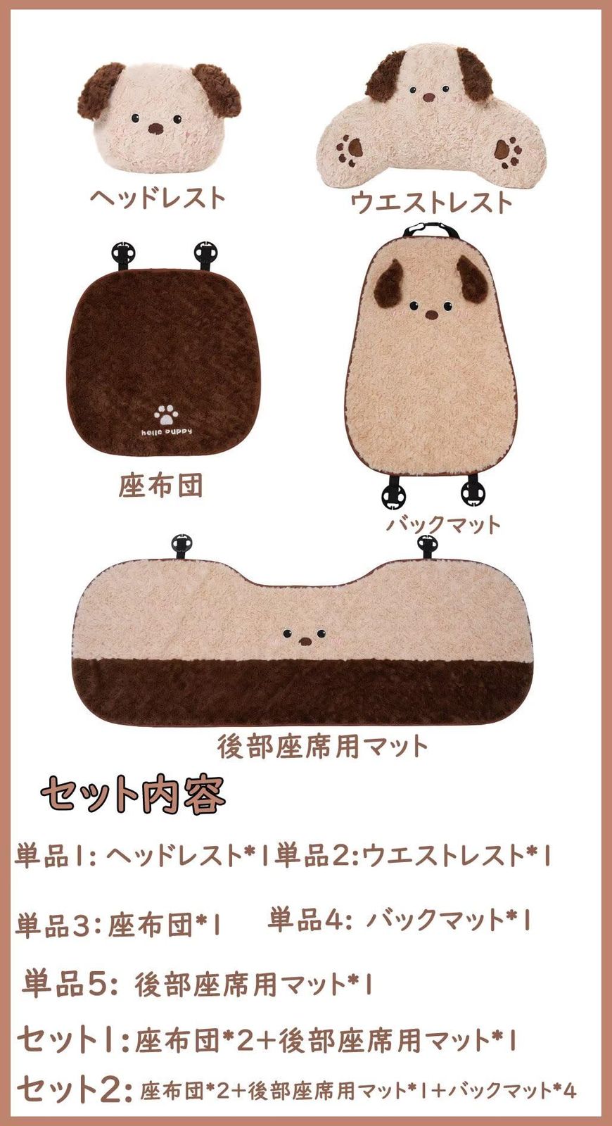 セット内容:単品1:ヘッドレスト*1 単品2:ウエストレスト*1 単品3:座布団*1 単品4:バックマット*1 単品5:後部座席用マット*1 セット1:座布団*2+後部座席用マット*1 セット2:座布団*2+後部座席用マット*1+バックマット*4