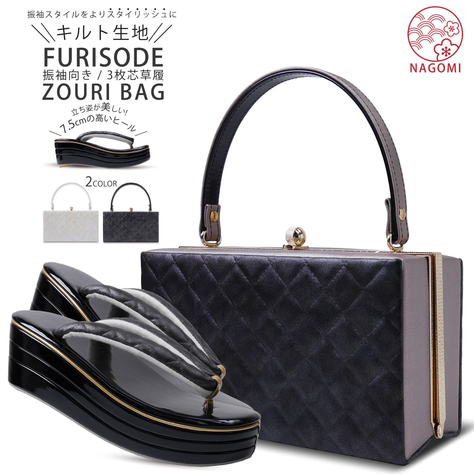 スクエアデザイン×キルト合皮の振袖向き草履バッグ2点セットです。 黒と白のカラーバリエーションはどんな着物にも合わせやすく、