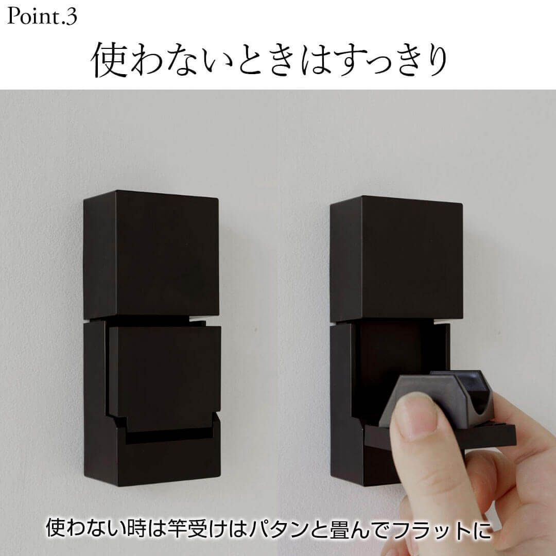 物干し竿は取り外しが自由で、付属の竿掛けに掛けられるようになっています。竿が倒れる心配がないので安全。さらに、竿受けはパタンと畳んでフラットになります。