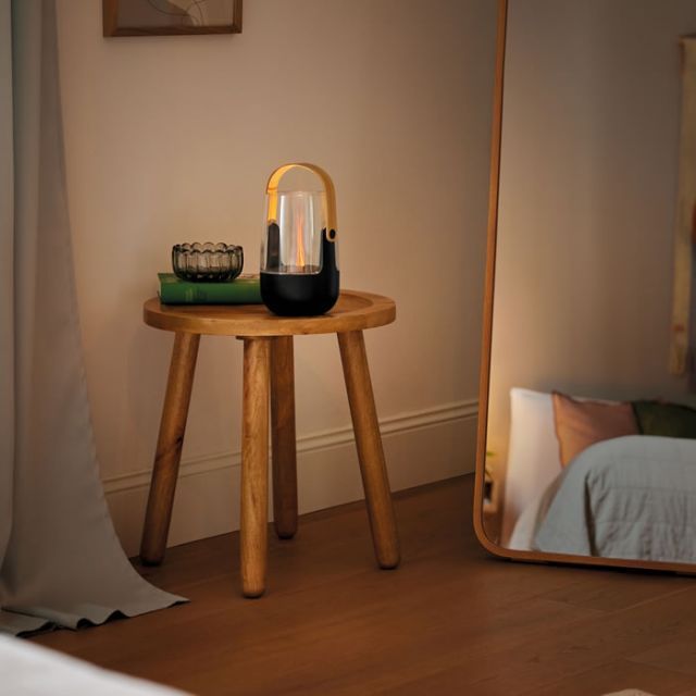 屋内外で使用できるバンブーハンドル付のモバイルアロマディフューザーディフューザーの冷たいミストを使用して炎のような演出をします。IP44で屋外用のランタンとしてや、エッセンシャルオイルを使用した天然由来の虫よけにも最適です。