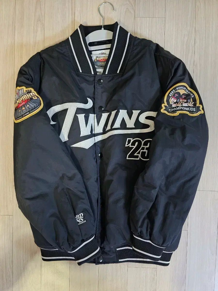 タグのみ取り除かれたLG트윈스 챔피온 アウター ブラック カラーです。Lサイズで、2023年 チャンピオン 記念 パッチが腕に付いています。タグのみ取り除き、収納のみしていた新品で、状態はSSS級です。