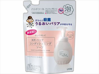 きちんと殺菌するだけでなく、「うるおいバリア」が手洗い後も手肌にとどまる新処方採用バイ菌から手肌を守り、毎日働く“手”を思いやる、泡タイプのキレイキレイ薬用ハンドコンディショニングソープです。●きちんと殺菌●うるおいバリアが手肌を守る●つめかえ用400mL●せっけんの香り