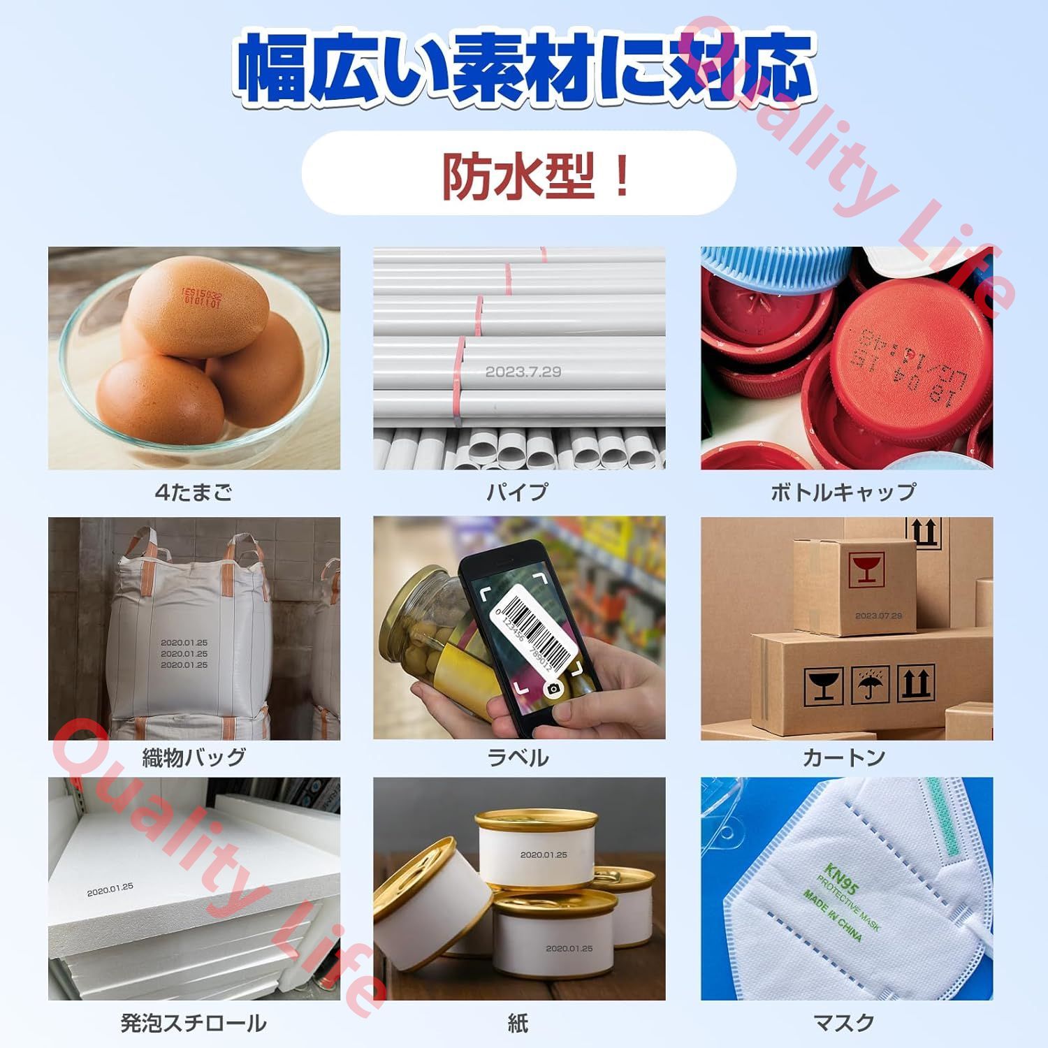 【幅広い素材に対応】防水型インクで、たまご·パイプ·ボトルキャップ·織物バッグ·ラベル·カートン·発泡スチロール·紙·マスクなどの素材に印刷られます。また、位置決めプレート付きで、狭い場所に適しています。