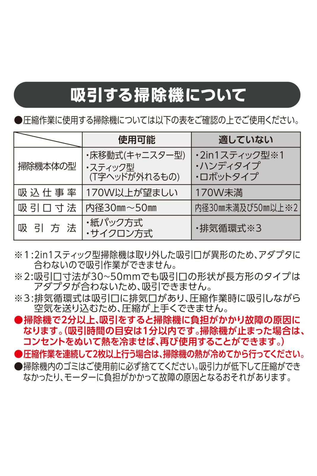 【使用上の注意】エアッシュとバルブを垂直にすきまなく密着させることで早く圧縮することができます。吸引時間は60~120秒を目安として下さい。吸引時間 120秒以上使用する場合は電源を切り15分程度おいて、本体を十分冷ましてから再度ご使用ください。