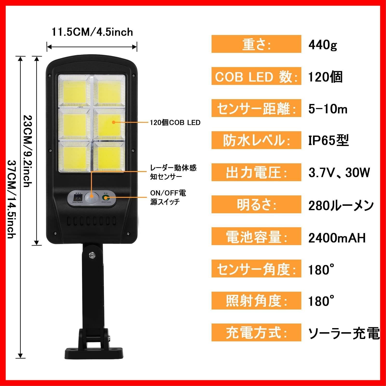 【120COB LED・センサー角度180°】:パッケージにはソーラーセンサーライト×1個、取扱説明書×1枚、ネジ2本を含めています。 通常のCOB LEDセンサーライトと比較して、このソーラーライトは120個COB LEDがあるから、より強い明るさを持っています。LED街灯のセンサー検知角度は180°、 照明範囲は180°で、センサー距離は5m~10mです。人や動物がこの検知範囲に入る限り、センサーライトは自動的に点灯します。