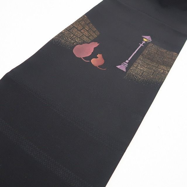 ❁tomihisa❁ 猫 着物 正絹 街灯に照らされる静寂の猫 なごや帯 7044