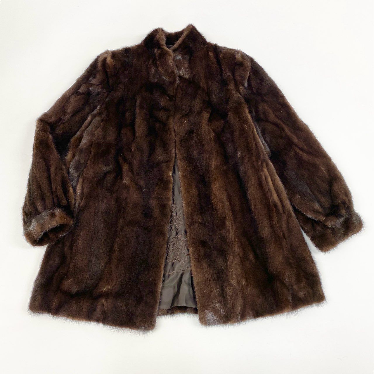 艶やかなデミバフミンクのダークブラウンコート。上質な光沢を帯びた毛並みが滑らかで、動くたびに奥行きある輝きを放ちます。81cmのミドルロング丈でエレガントな印象を与えつつ、軽やかに羽織れるバランス。内側には花柄刺繍入りのブラウン裏地を採用し、見えない部分にも高級感を演出。フォーマルな場面から冬の街歩きまで、気品と暖かさを兼ね備えた一着です。