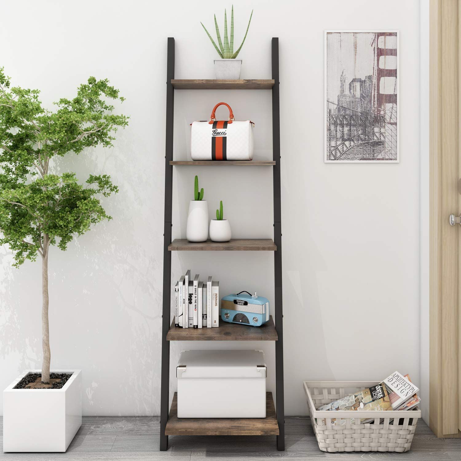 O&K オープンシェルフ 飾り棚 棚ラック木製 5段ラック おしゃれ 本棚スリム 壁面収納 北欧スタイル ブラウン 収納棚 玄関 リビングルーム 木目幅45×奥行35×高さ154.3cm(ブラック)