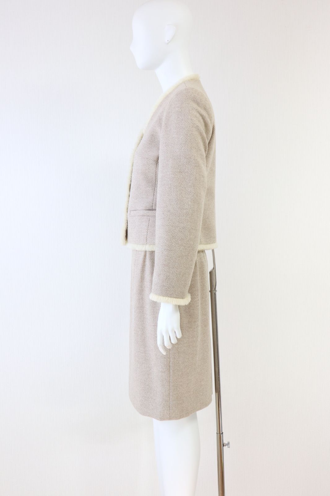 ルネブティックの商品、アイボリー×ベージュのヘリンボーン柄ツイード生地のジャケットとスカートのスーツです