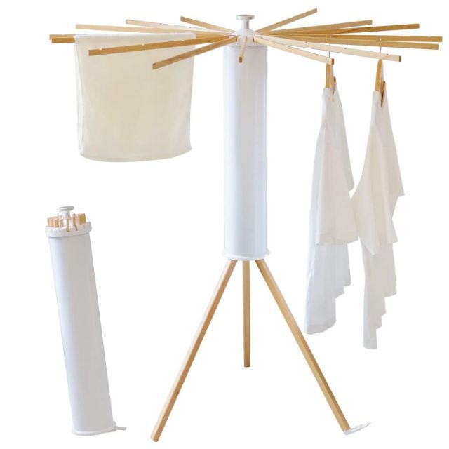 【空間を節約する】三角スタンドと干し棒は全部円筒に入れ、片手で持ち上げ可能で、任意の隅に自由に置き。全部展開する時、天然木物干し竿16本、タオル16枚干せる。しっかり支える三本足構造で安定性あり、倒れにくい。