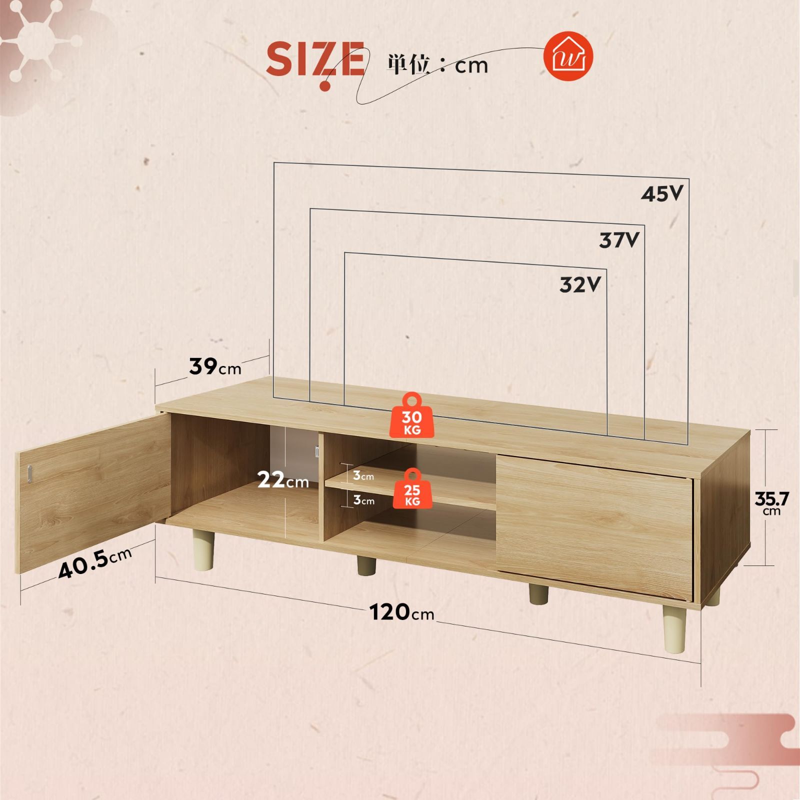 頑丈な構造:テレビ台全体の素材はE1級メラミン化粧板を利用し、頑丈性がパッチリです。また木板は1.5cmの厚さがあるので、より高い強度が実現し、長期間ご使用いただけます。長方形の全体構造、そして六本の足がボードをしっかりと支えてくれるので、天板部分は40kg耐え、扉内の収納部分の耐荷重は約30kgです。さらに、全体的な耐荷重は驚きほどの100kgも達します!