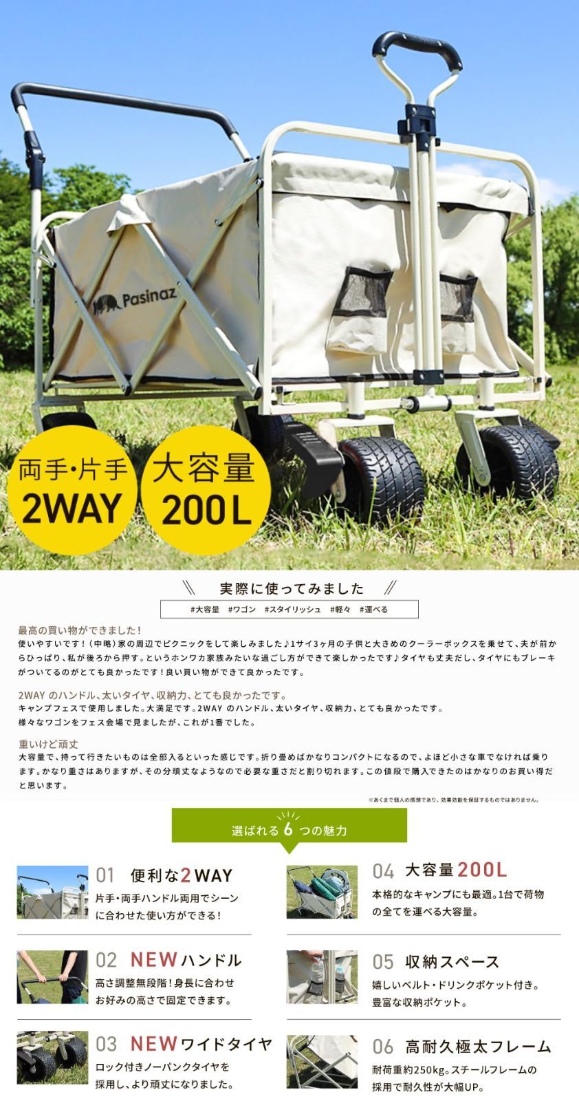 コンパクト ワイドタイヤ 折りたたみ ストッパー付き 軽量 ノーパンクタイヤ キャンプ ミニ 高さ調整 子供 耐荷重250 kg アウトドアワゴン キャリーカート キャリーワゴン 2 way BBQ 片手ハンドル 大型 両手ハンドル 公園 大容量200 L
