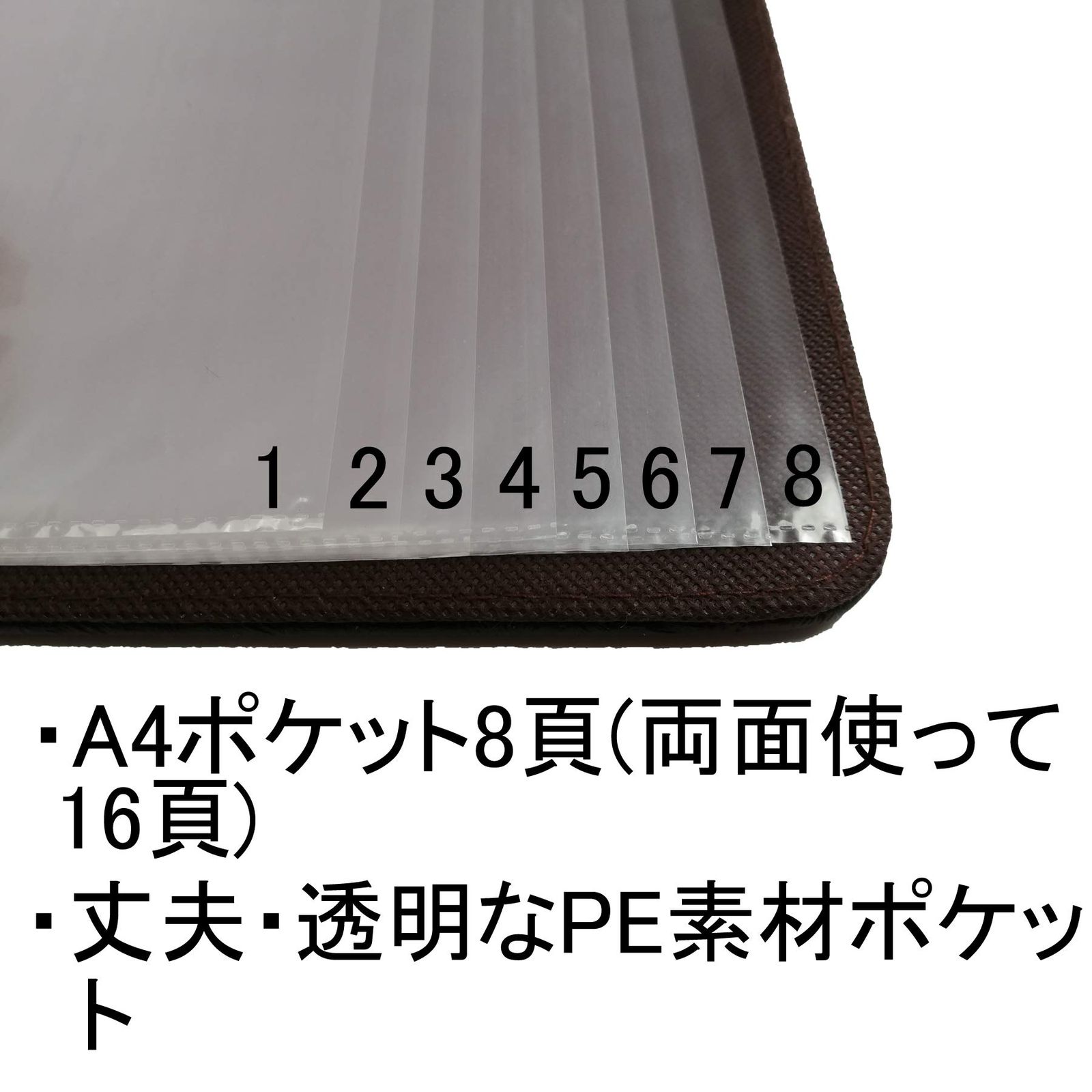 A4サイズのメニューがすっぽり入る透明度の高いPE(ポリエチレン)ビニールポケットが8ページ分。カラフルにA4サイズをフルに使えます。縦挿しなので簡単に差し替え可能。営業時間変更・メニュー画像変更・商品価格変更・新しいメニューと差し替えるだけの便利な仕様。