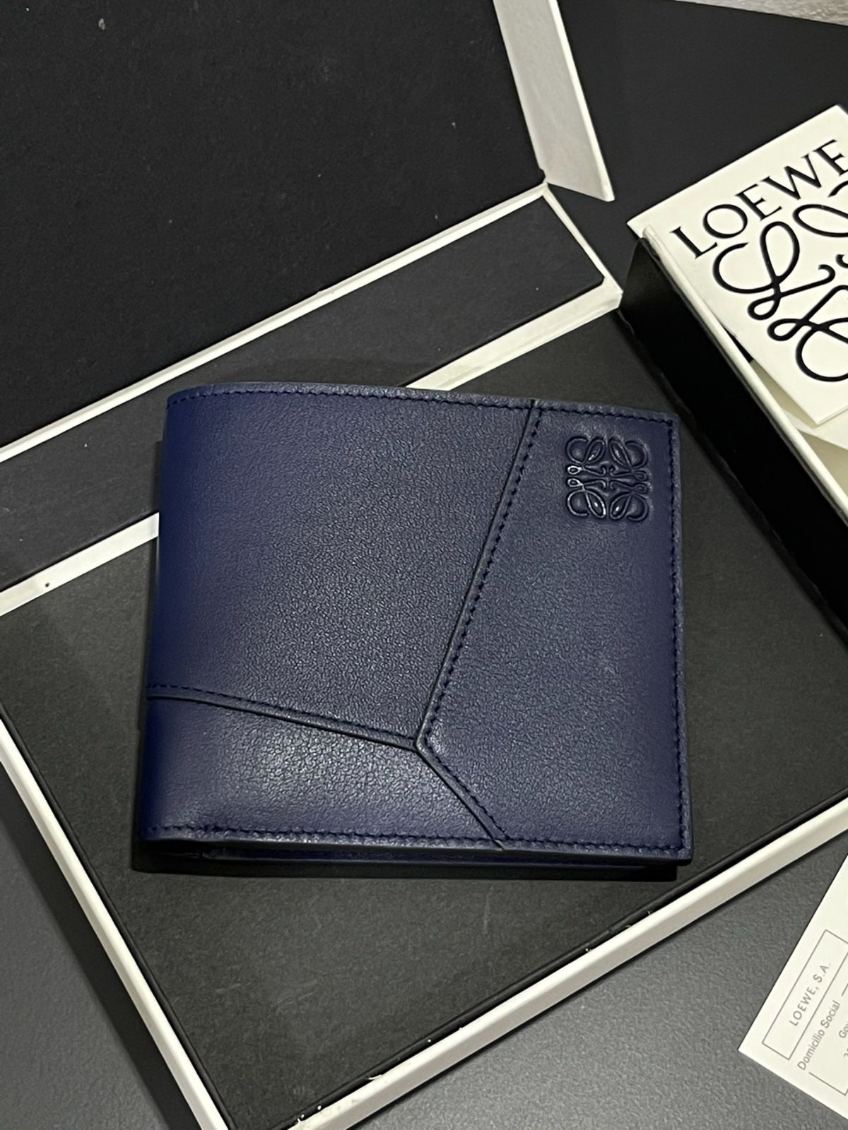 LOEWE 牛革 メンズ ブルー 二つ折り財布 ショートサイズ パズルシリーズハンドバッグから着想を得た ユニークな幾何学模様を採用 クラシックな小牛革素材を使用 カードポケット8つと大型ポケット2つ付き サイズ 11 10 cm フルパッケージ時