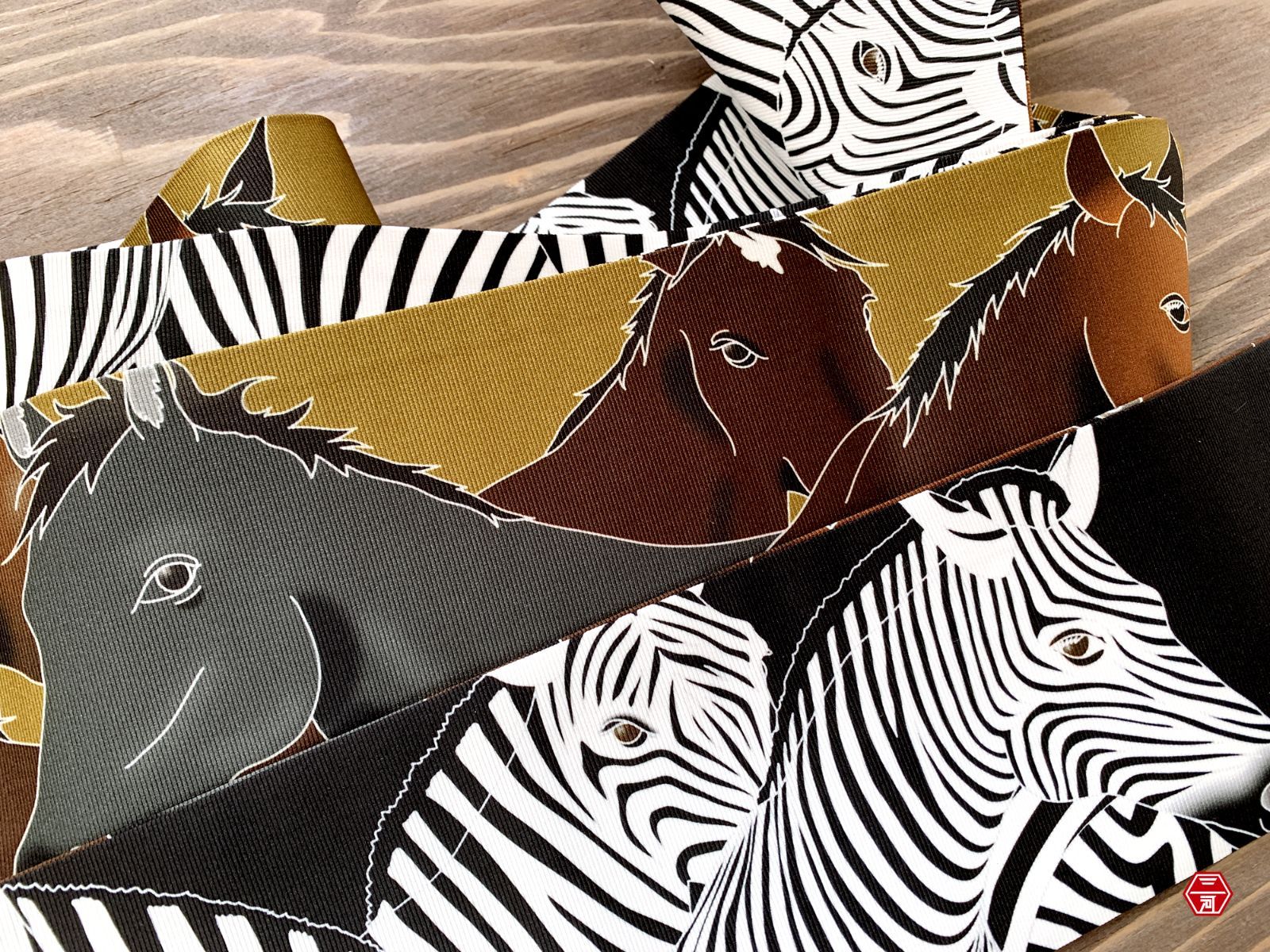 愛嬌のある馬・シマウマの柄の角帯です。馬は茶系を使用しシマウマには白黒を使用していますので着物や浴衣にコーディネートしやすい配色のデザインです。こちらの帯は両面お使いいただけます。お着物や、その日の気分に合わせて2通りの組み合わせをお楽しみいただけます。帯は塩瀬のような風合いの生地を使用していますので、締めやすく緩みにくいのが特徴です。