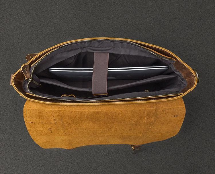 こちらのバッグは、上質なフルグレインのフォースレザー(牛革)を使用し、ヴィンテージ感漂うブラウンカラーが独特な風合いを演出しています。ダブルレザーベルトのデザインで、見た目の美しさだけでなく、小物の収納にも便利。大容量のメインコンパートメントには、33cm × 23cm のノートパソコンなども余裕で収納可能です。