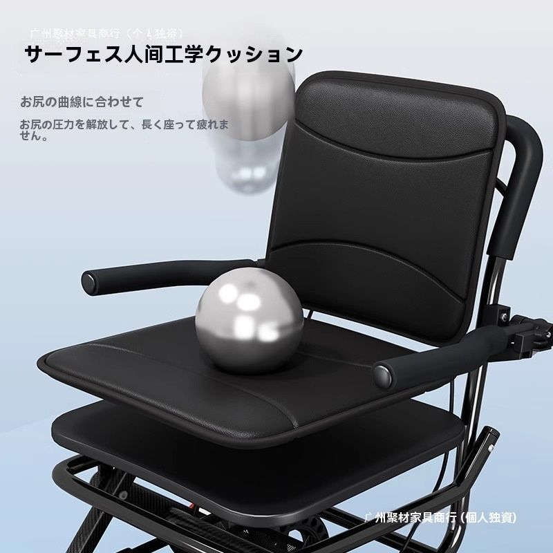 背もたれ&クッション付きの座面があり、歩き疲れた際にはそのまま椅子として座ることが可能。12インチの大口径蜂の巣状中空タイヤは、滑りにくく衝撃吸収力に優れており、段差や坂道でも安定した走行が可能です。