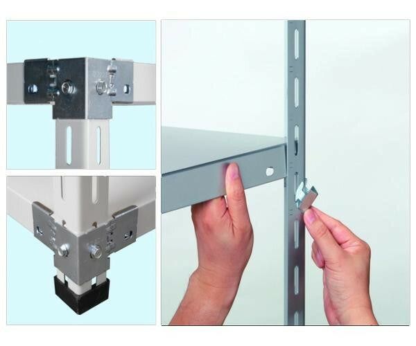 特製金具で水平・垂直が出しやすい。中段はフック留めで棚板移動らくらく。