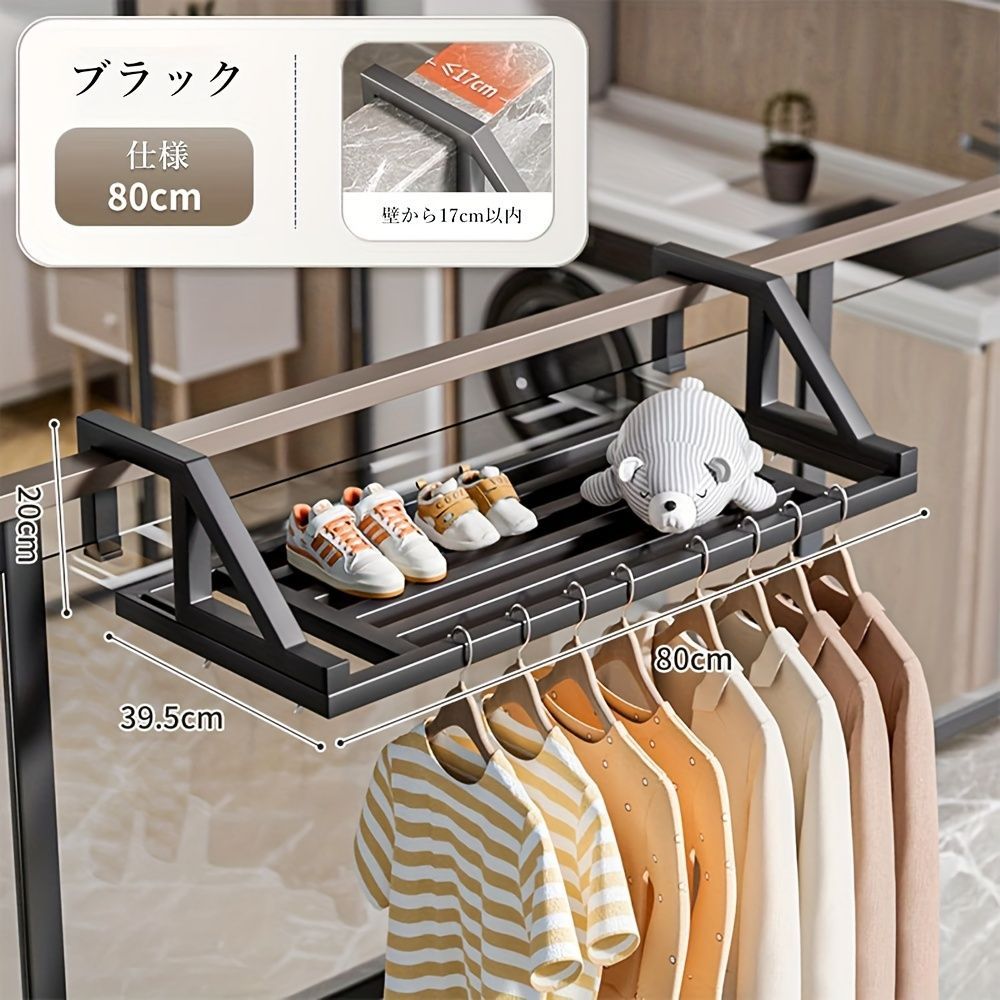 取り付けも簡単で、かつしっかりと固定されるので重量があるものもたくさん干すことができます。また収納棚としてもお使いいただけます。サイズは80cmと100cmからお選びいただけます。