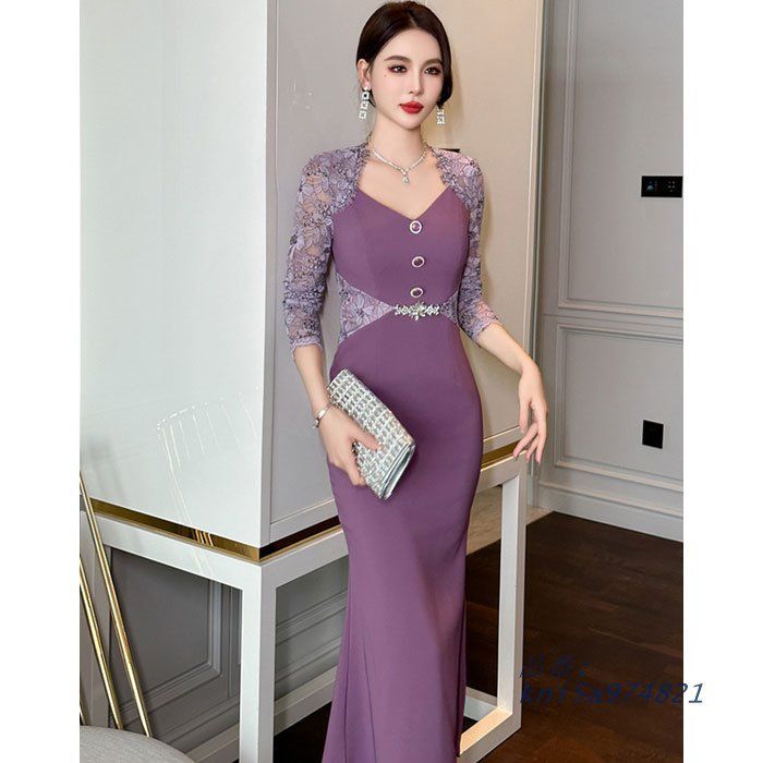 レース刺繍長袖 胸元開き前ボタン ロング丈タイトドレスワンピース 紫 結婚式 お呼ばれ ドレス おしゃれきれいめ 韓国 kni 5 a 974821