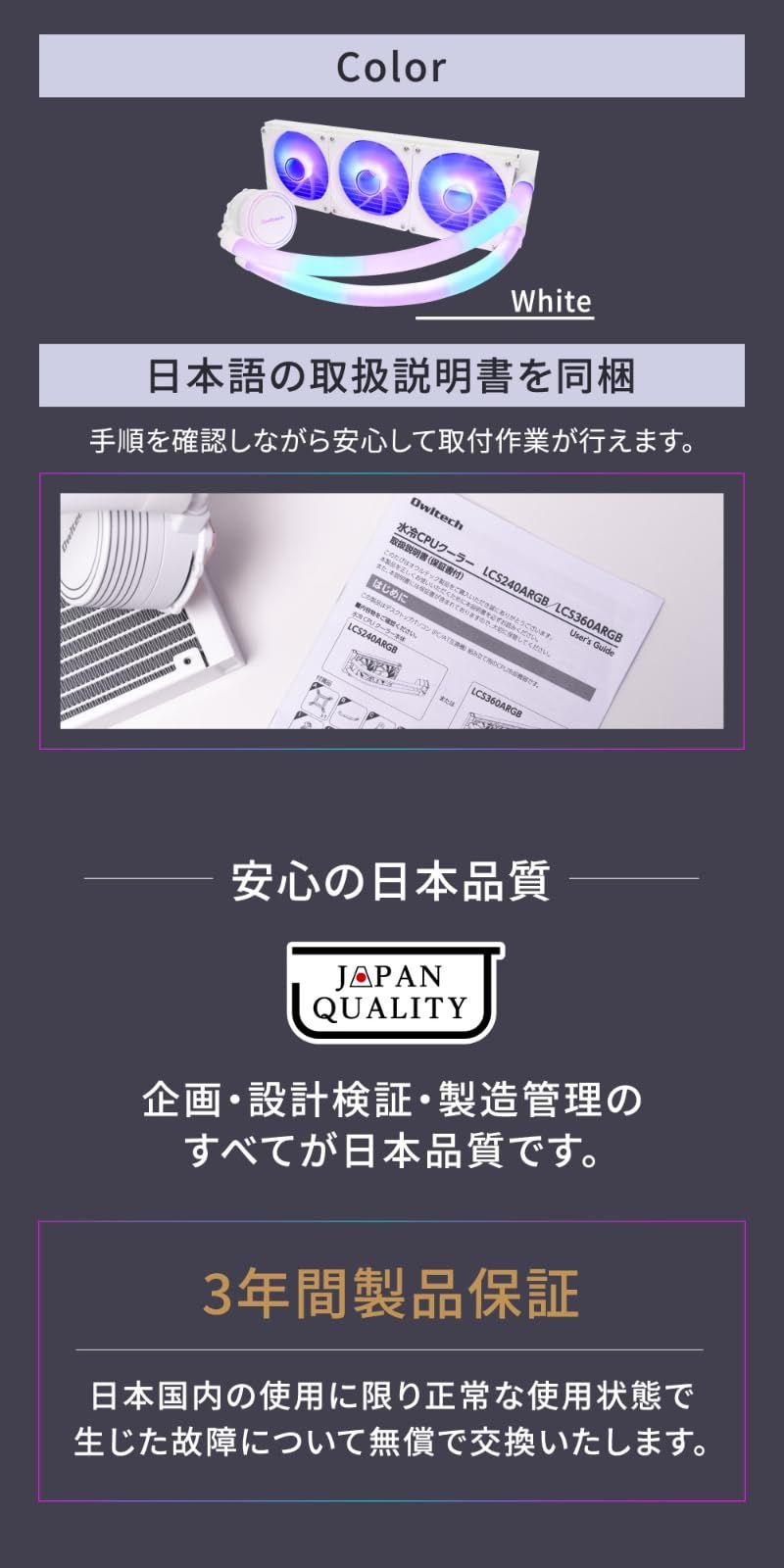 オールホワイト系のゲーミングPCに最適な水冷CPUクーラー:本体の細かな部分まで白にこだわった、華やかな光を引き立たせるのに最適なCPUクーラーです。PC内部を彩りながらPCゲームや動画編集で発熱したCPUを効率的に放熱します。使用環境や用途に合わせて選べる2種類のラジエーターサイズ:コンパクトさと冷却性能を両立する240mmサイズの「OWL-LCS240ARGB-WH」と、3つのファンで確実にしっかりと冷却する360mmサイズの本製品の2モデルを展開。必要な冷却性能やお使いのPCケースに合わせてお選びいただけます。