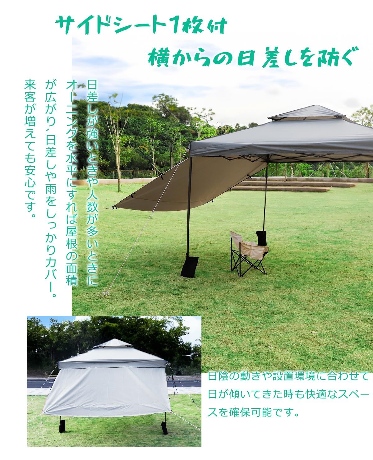 【サイドシート4枚付 日陰の動きや設置環境に合わせて】①日差しや視線を遮断し、オーニングを傾けることで快適なスペースを確保できます。②人数が多いときに、オーニングを水平にすれば屋根の面積が広がり、日差しや雨をしっかりカバー。来客が増えても安心です。③風が強いときや人目を隔てたいとき、オーニングを畳めばサイドからの風や雨のブロックに。ちょっとした目隠しにもなります。