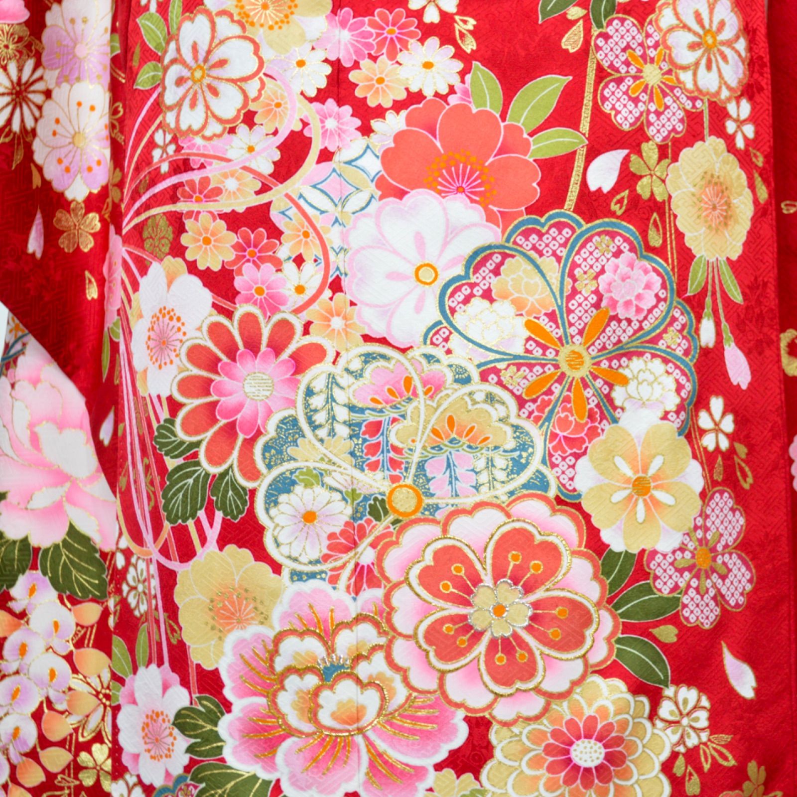 深みのある赤地に、牡丹や桜、菊などの古典花を贅沢に散りばめた華やかなお振袖です。