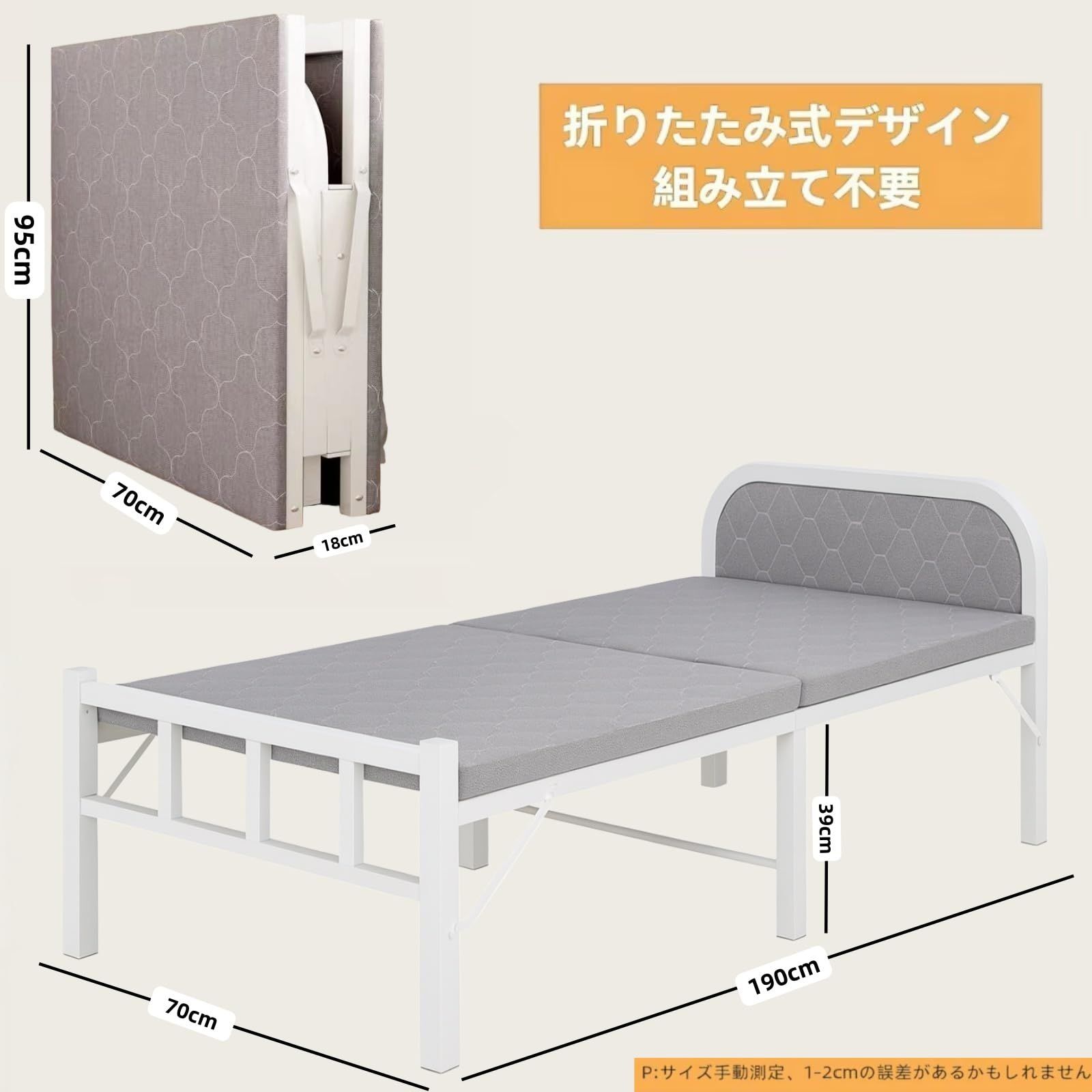 ??【折りたたみ式デザイン】シングルベッドは、簡単に折り畳むデザインを採用。使用時はフルサイズのベッドとして快適に寝れる一方、非使用時はコンパクトに折り畳むことが可能。折りたたんでおけば、場所を取らず、必要な時にすぐに利用できるため、効率的に空間を活用できます。