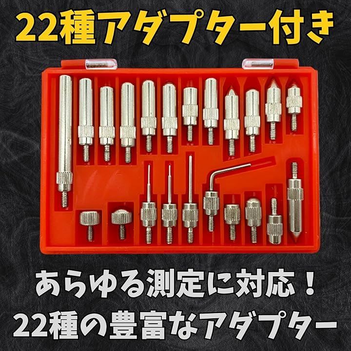 「専用収納ケース付きで持ち運びも便利」ダイヤルインジケーター、アダプター22個、マグネットスタンドをすべてまとめて収納できる専用ケース付き。