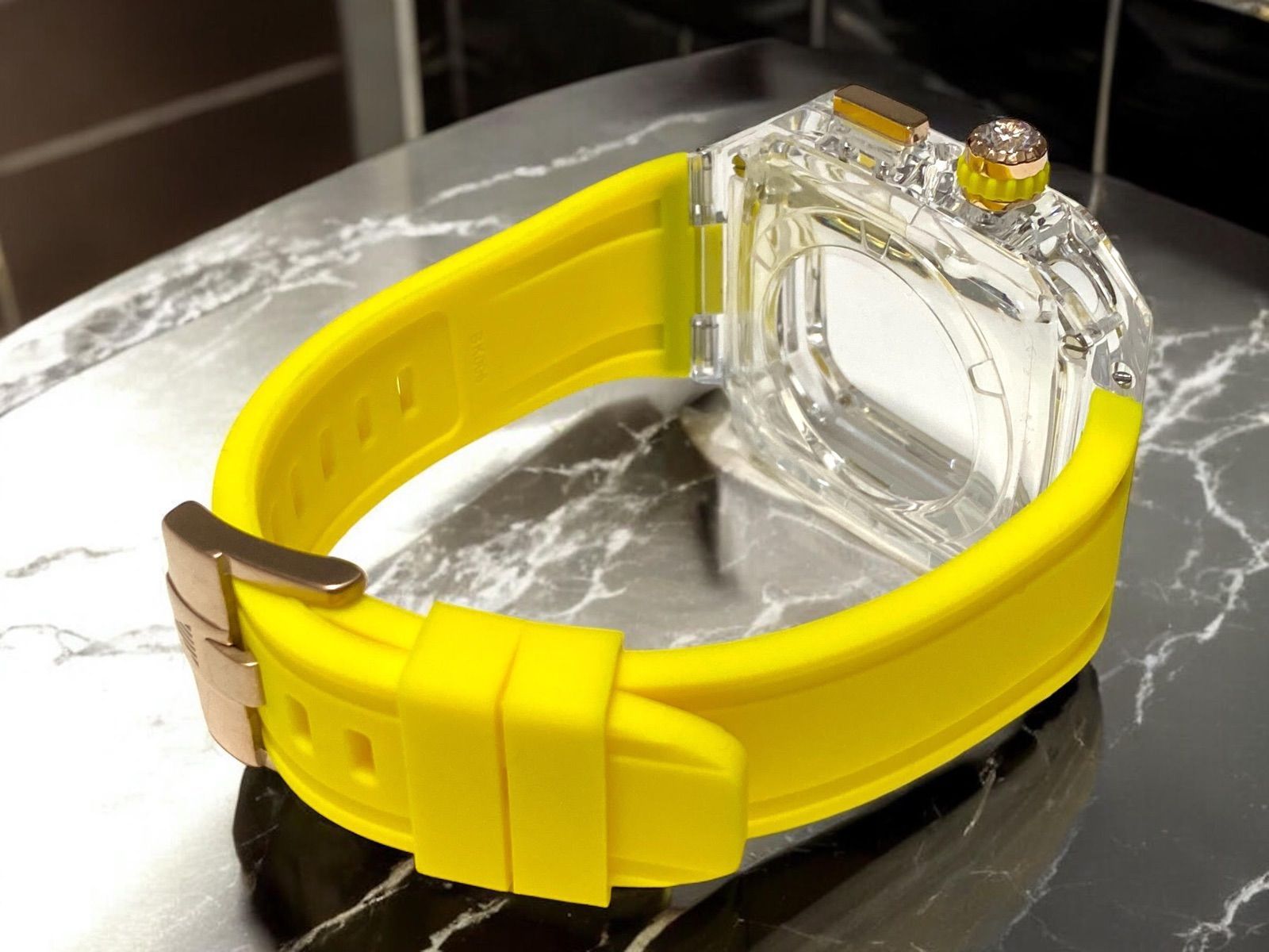 クラウンには透明度と輝きが美しいジルコニアが装飾され、ラバーは一際柔らかくバックルはダイヤモンドメタルカットをセットしています。