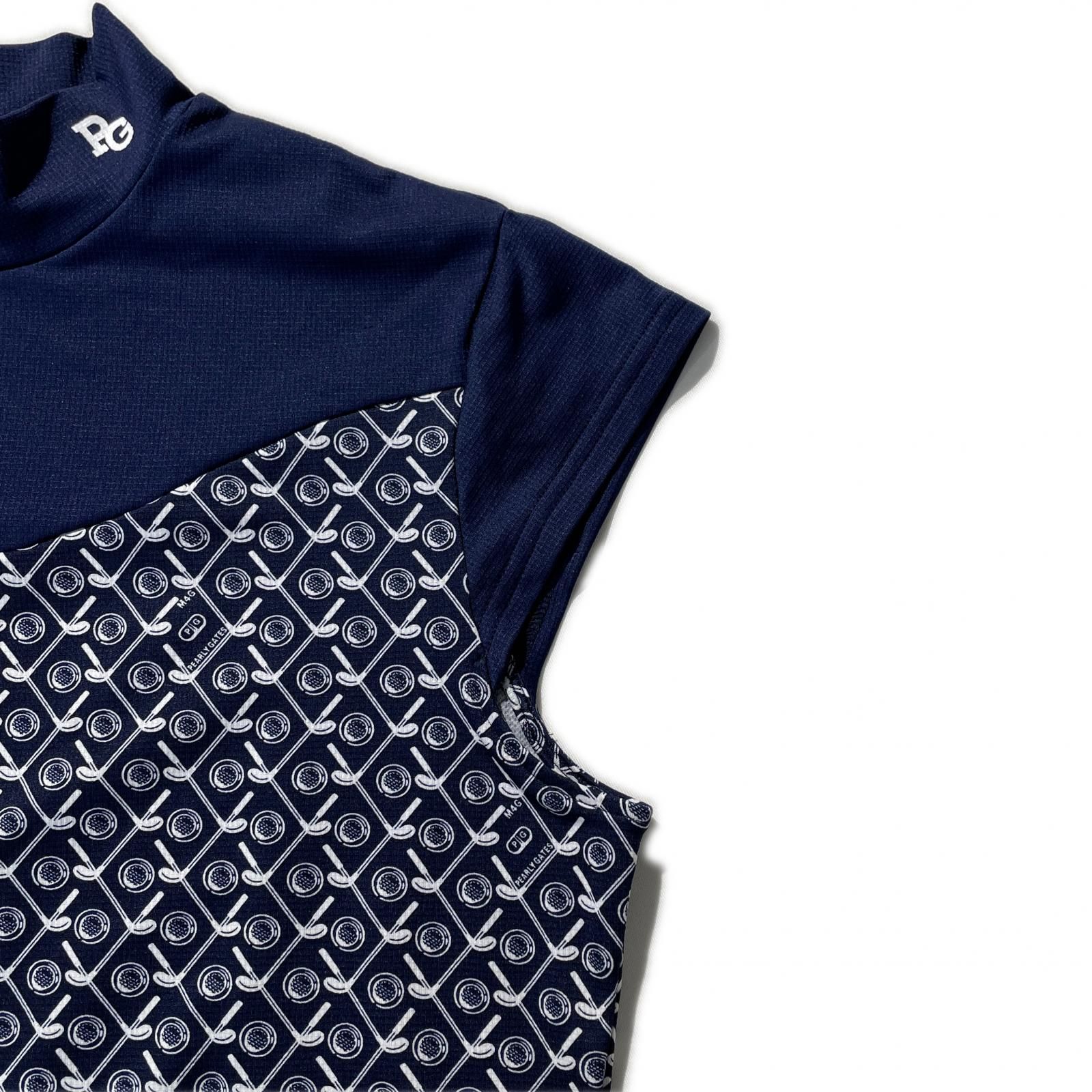 レディース パーリーゲイツ PEARLY GATES 半袖シャツ 2 L 紺×白 ネイビー モックネック 総柄